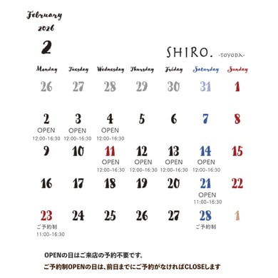 ご予約制の日は、前日までにご予約がない場合CLOSEとなります。スケジュール以外でご来店をご希望される場合はお問い合わせください。