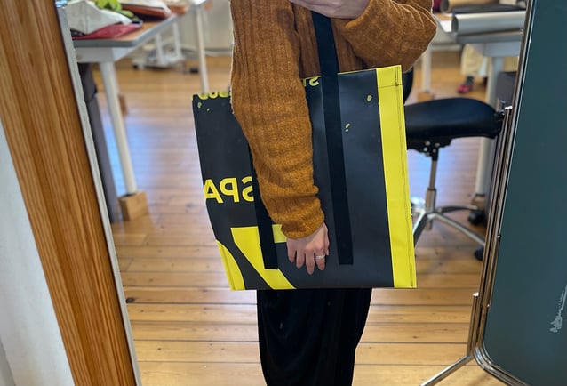 私はスーパーで使われていた広告用のビニール生地を使って、トートバッグやクラッチバッグを作りました。