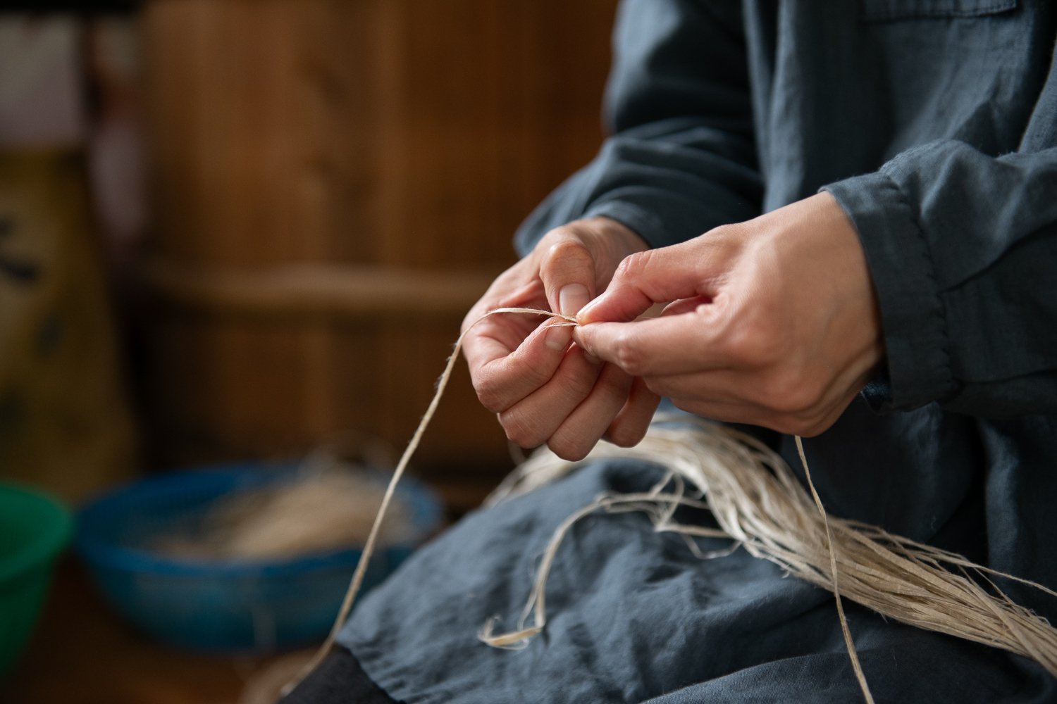楮の繊維については、「素材の質感がリネンと綿の間みたいな感じですね。太布の糸は和紙と同じ楮でできています。」と、三嶋さんが糸績みの様子を見せてくださいました。
