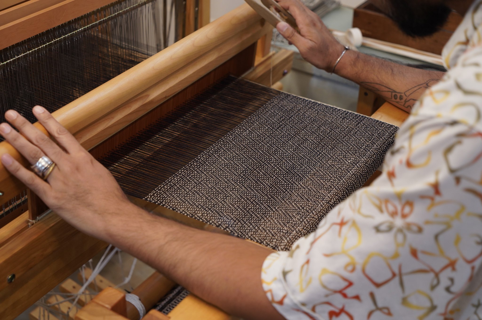 普段、リジットや2枚綜絖の織り機を使われている方向けに、小型のろくろ式織り機を使用して 4枚綜絖のろくろ式織り機で杉綾マフラーを織る内容です。